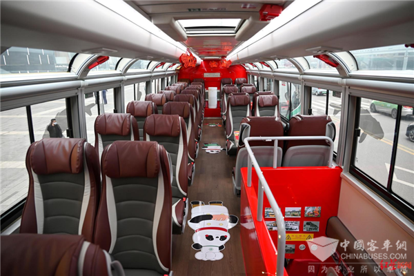 第二层采用顶层全景天窗设计,让乘客仿佛置身天地之间,蓝天白云与现代摩登楼宇相环抱,360°全方位欣赏成都迷人城市风光,无论是繁华热闹的高楼林立、车水马龙,还是恬静悠闲的背街小巷,各种风光全都能收入眼底。