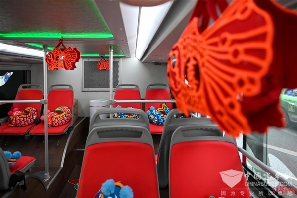 为最大程度满足旅客出行需求,格力钛新能源脸谱双层巴士采用双层空间优化设计,通道宽敞明亮,整体布局科学合理。第一层融合互联网等信息技术,搭载触屏导览地图、语音播报、智能货柜等功能,传达创新的现代文化理念,为游客带来智能化的“花样玩法”。
