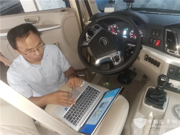 读取故障码、逐个排查车辆问题……一切都紧锣密鼓进行着。下午技术人员到达现场,又逐步开展报文读取、报文分析和与车辆配件厂家远程沟通等工作。时间一点点流逝,可能出问题的范围也变得越来越小,历经近3个小时,故障原因终于找到,第一台车问题顺利解决!