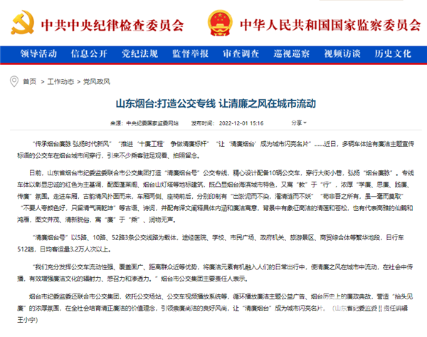 “我们充分发挥公交车流动性强、覆盖面广、距离群众近等优势,将廉洁元素有机融入人们的日常出行中,使清廉之风在城市中流动、在社会中传播。”烟台市公交集团负责人表示。