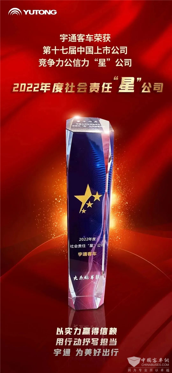 2022年12月底,在由大众证券报举办的第十七届中国上市公司竞争力公信力“星”公司评选中,宇通客车荣获2022年度社会责任“星”公司。该榜单是中国资本市场上备受专家、学者、投资机构、上市公司以及广大中小投资者关注的评选活动。本次上榜中国上市公司竞争力公信力“星”公司评选榜单,是对宇通始终永葆初心,在公益道路上的前行与探索的认可与肯定。