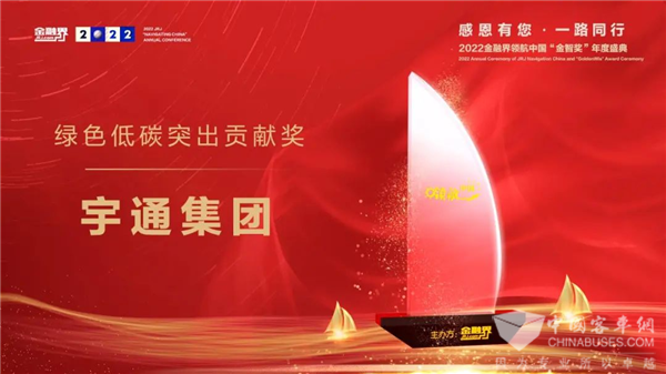 2022年12月30日,由《金融界》主办的第十一届金融界领航中国年会暨2022领航中国“金智奖”年度盛典揭晓,宇通集团荣获“绿色低碳突出贡献奖”。