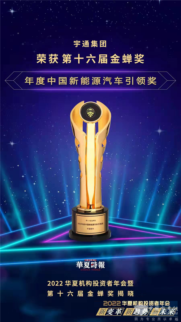 2023年1月6日,由《华夏时报》主办的“新变革 新趋势 新未来——2022 华夏机构投资者年会暨第十六届金蝉奖”揭晓,宇通集团荣获“2022年度中国新能源汽车引领奖”。