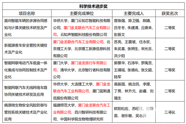 2023年2月6日,福建省人民政府印发《关于2021年度省科学技术奖励的决定》,对2021年度在科学技术进步活动中作出重要贡献的科学技术人员和组织给予奖励。经统计,厦门金龙汽车集团权属企业共有5个项目榜上有名,其中,获得科学技术进步奖二等奖4项,三等奖1项。具体名单如下: