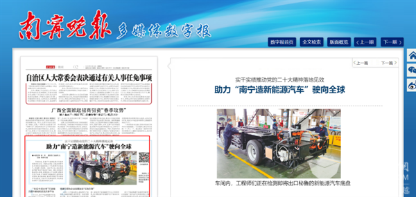 在本年年初的《产业一线话振兴》专题中,南宁晚报则对广西申龙从党的二十大精神中汲取营养,助力当地新能源汽车产业“换道超车”、加快发展等议题上进行了不同角度的新闻报道。