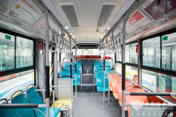 在安全性、舒适性方面,车辆“零台阶”、全平地板,一级踏步的低入口可减少因台阶导致的摔伤事故,符合适老化车辆的要求。此外,相较于传统的新能源公交车,宇光E8 MAX对驾驶员来说更为“贴心”“友好”。车内不仅安装了360度监视系统,还有智能防碰撞预警、驾驶行为分析、盲区辅助等智能系统的加持,保障行车安全。