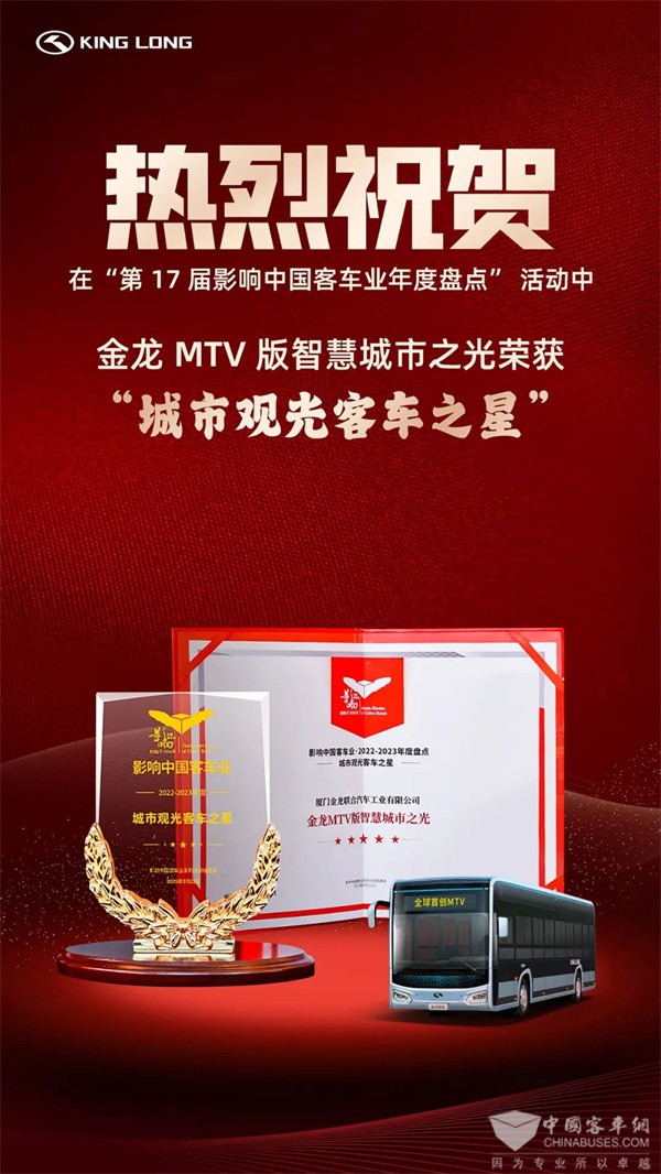 中国客车行业首款MTV版智慧城市之光客车由金龙客车于2022年9月19日正式下线,进一步推动全球公交电动化进程,大步迈进新能源4.0时代。在本次颁奖典礼上,金龙MTV版智慧城市之光凭借MTV技术具有高集成、高比能、高安全、高效率的优点荣获“城市观光客车之星”大奖。