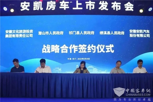 在精心布局和精耕“品质”之下,安凯客车也顺利交出了华丽跨界的精彩答卷——在推出安凯房车新品的同时,成功实现签约,不仅与安徽文化旅游投资集团、潜山市人民政府、祁门县人民政府、绩溪县人民政府签署战略协议,为推动我国露营经济发展贡献力量,同时活动现场还与多家经销商签订合作协议,安凯客车正在用实力开启房车领域新征程。
