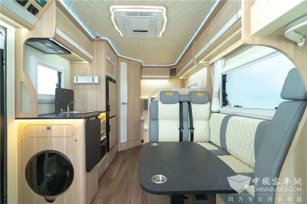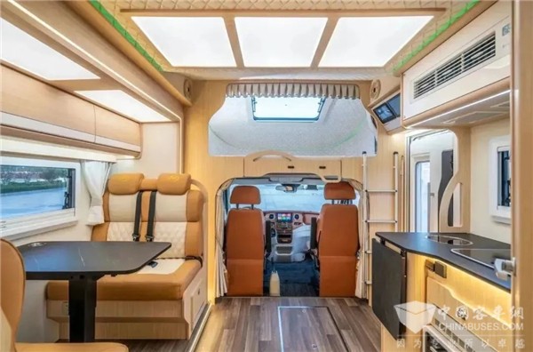 C型无拓C570,内饰欧系风格经典浅木纹家具饰面,环形座椅及后纵床布局,空间留用率高;搭载知名品牌房车冰箱、烘烤一体机、高功率电磁炉;L型台面延长板,宽敞操作台供你施展厨艺;45.68万的起售价也让其成为品质与性价比兼顾的尚佳之选。
