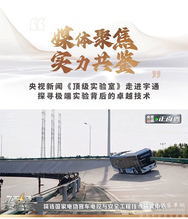 宇通在新能源领域的强劲实力,获得主流媒体的关注与聚焦。6月,央视新闻重磅推出的大型科普类系列直播节目——《顶级试验室》,走进了国家电动客车电控与安全工程技术研究中心,全方位展示中国新能源商用车在产品研发、技术创新等方面的成果,更展示了宇通在新能源商用车领域的硬核技术,演绎了民族制造的自信与荣耀!