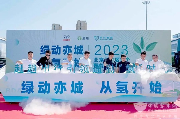 2023年7月25日上午,北京经开区首个氢能客车示范项目启动仪式举行。本次活动以“绿动亦城 从氢开始”为主题,20台12米苏州金龙海格氢燃料客车从北京赶趟出行科技有限公司(以下简称赶趟出行)位于北京经济开发区的场站徐徐驶出,执行线路运营任务。这标志着北京经开区首批氢能客车项目顺利落地,也意味着苏州金龙、新研氢能源科技有限公司(以下简称新研氢能)、赶趟出行三方强强联合,首度将氢能客车产品批量打入北京市场,促成了氢能源科技、智能网联公共服务和智慧车辆制造业的价值融合。