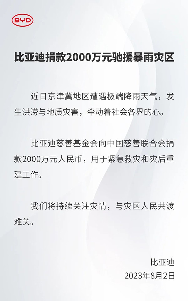 助京津冀紧急救灾与重建 比亚迪捐款2000万元驰援暴雨灾区