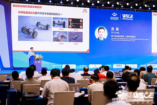 在全体大会上,厦门金龙副总经理、工程院院长苏亮,以“智能集成底盘技术研究”为主题,和参会嘉宾们就智能集成线控底盘发展趋势、金龙对商用车智能集成线控底盘的规划以及产业突破等话题展开了深入的讨论与交流。