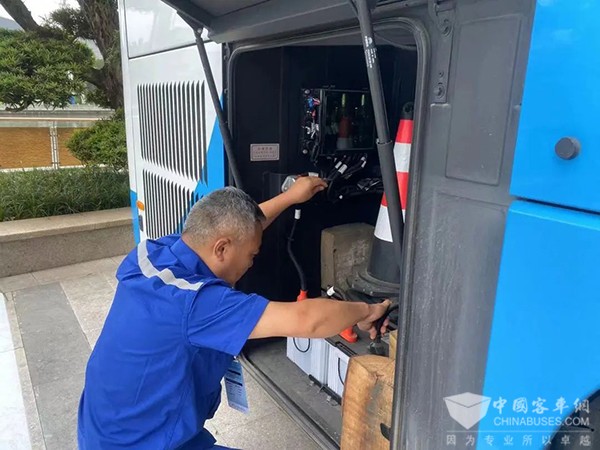 纯电式大型客车工作原理、内部构造与传统燃油客车截然不同,为此集团抽调新能源公交车汽修的技术骨干组建专业维修保障队伍。得益于近年来大量纯电式公交车辆的投入使用,集团通过“走出去、引进来”的模式不断迭代维保能力,逐步建立了一支专业的新能源汽修队伍。参与该批新能源纯电式大型客车的维修人员,由城东公交公司、城西公交公司、汽车服务公司三家单位的汽修技术骨干组成,负责亚运专车的日常维护、保养、抢修及归场后的检查工作。