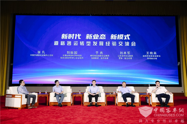 在各地优秀转型案例的经验分享过后,交通运输部科学研究院综合运输研究中心总工程师刘振国、青岛城运控股交运集团党委委员、副总经理于亮、山东滨州交运集团董事、副总经理刘本军、福田欧辉新能源客车营销副总裁王晓亮四位嘉宾以“转型升级 谋变求生”为主题进行了一场深刻的圆桌对话。