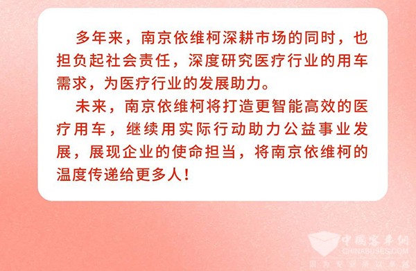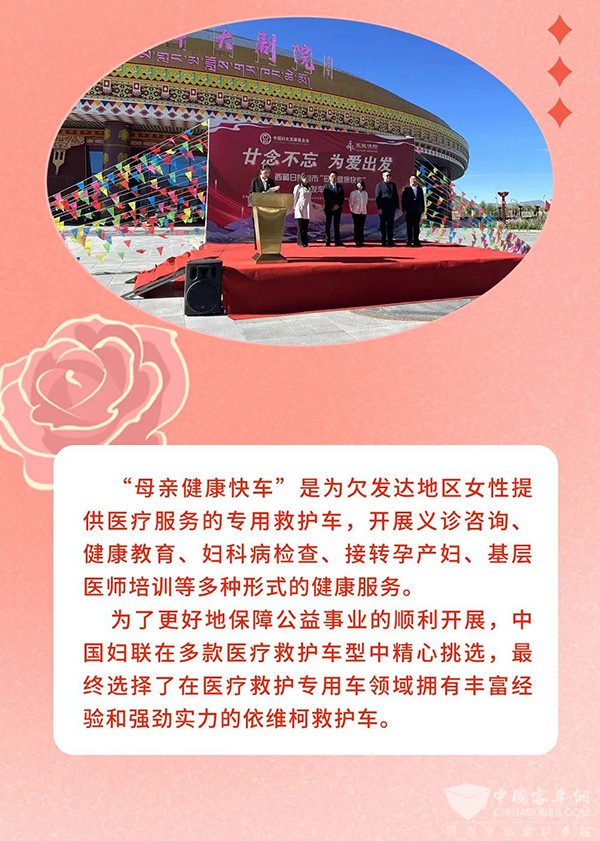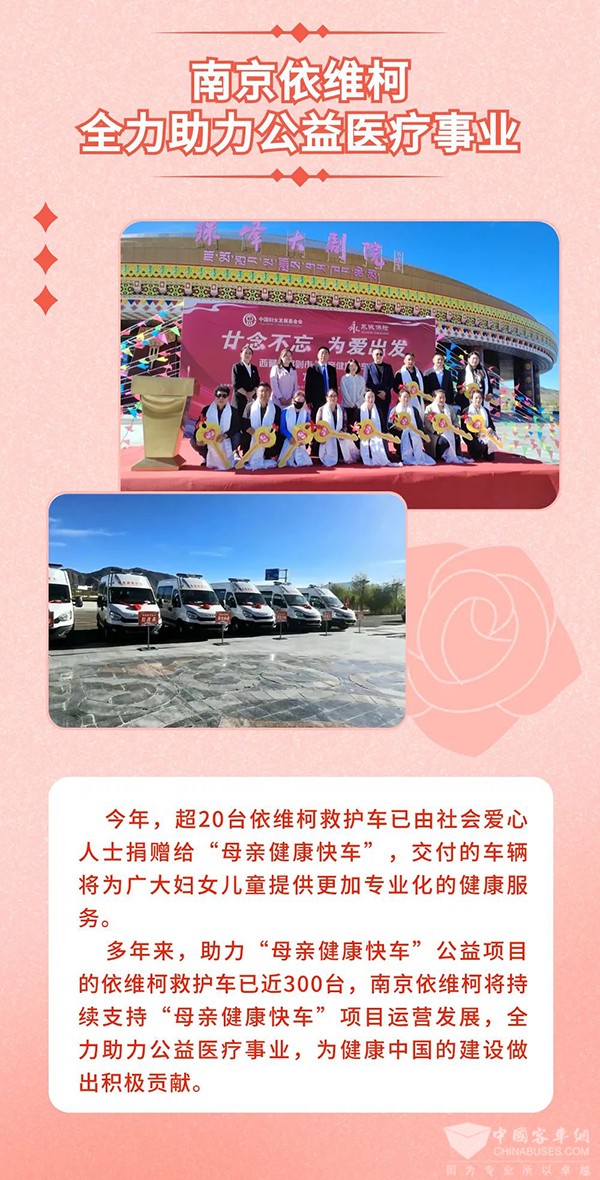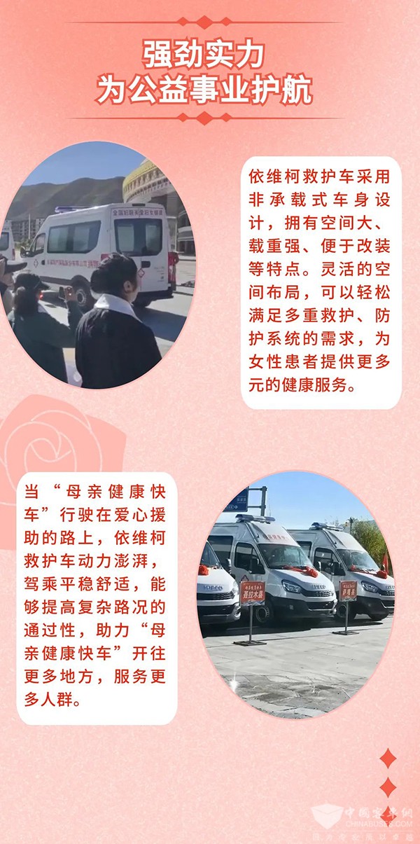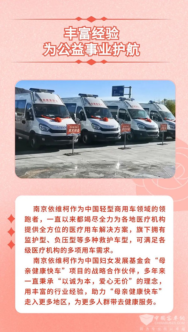 多年来,助力“母亲健康快车”公益项目的依维柯救护车已近300台,南京依维柯将持续支持“母亲健康快车”项目运营发展,全力助力公益医疗事业,为健康中国的建设作出积极贡献。
