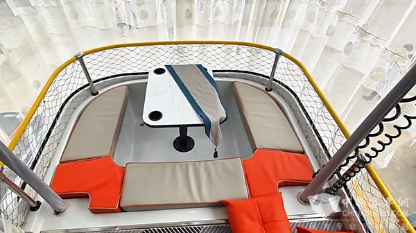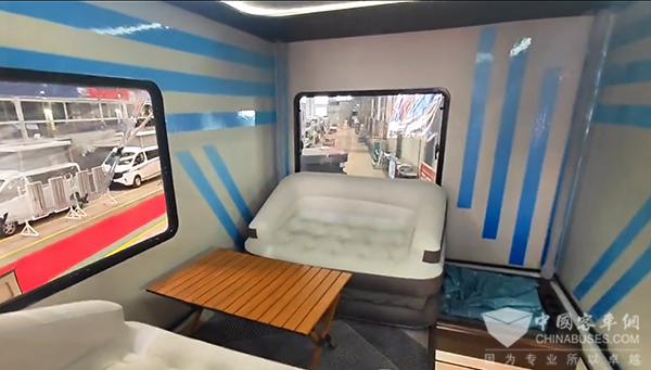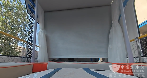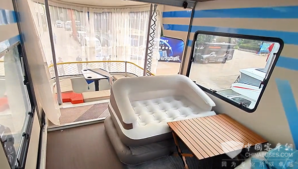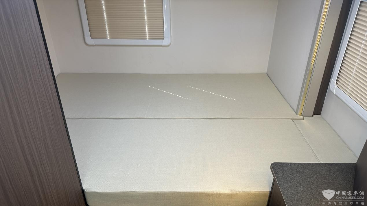 升顶的二楼也大有可为,能够适用全天候的天气场景下运用。后半部是独立可封闭区,可以作为卧室(配备独立屏蔽门与中央空调冷暖风),也可以作为会客室,前半部是半封闭区,设置有环形卡座,配有电控升降栏杆,专为旅居爱好者设计,前后区域提供更加多样化的空间优化。