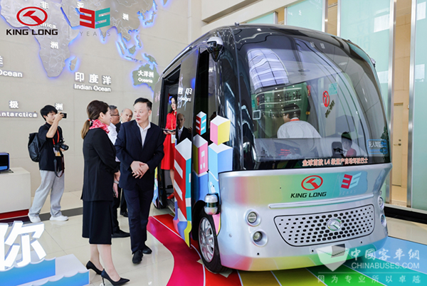 中亚中心媒体代表团成员带着满满的求知欲,前往参观金龙历史文化展厅,零距离观察金龙历史经典车型,深入了解金龙制造史、中国客车的变迁。在讲解员的带领下,成员们打卡了阿波龙展车,众人对这台又萌又酷的小巴士表现出了浓厚的兴趣,不少成员纷纷拿出手机拍照留念。金龙方负责人表示,阿波龙较之上一代进行了多项创新,优化并扩张了自动驾驶的算法和适用场景。新一代阿波龙具备车路协同和5G云代驾能力,在安全方面能将单车智能问题减少54%、路口急刹情况降低90%,保证在极端场景下车辆的行驶安全。目前阿波龙自动驾驶小巴已在全国45个城市及地区常态化运营,并已批量出口至中东地区,使大众交通进入新时代。
