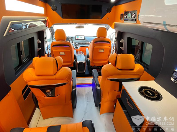 走进车内,聚星房车结合了商务车和房车的元素设计,整车内采用爱马仕橙和普鲁士蓝的搭配,充满霸气总裁范。聚星房车荷载6人,配备了2张航空座椅,可实现通风、按摩、加热功能,以及手机无线充电,非常智能舒适。路途中坐在航空座椅上不仅可以追心爱的电视剧或电影,还可以把主副驾背后的小桌板打开,出差也不耽误办公;而当你感到疲惫时,随手将后面座椅卡座一放,秒变1850*800MM的床,躺下休憩,十分惬意;再配合双侧开门设计,可左右两侧上下乘客,能够充分多人出行场景,为用户提供更方便灵活的用车体验,商旅感十足。