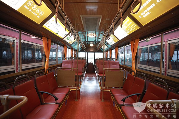 作为旅游专线上的“老网红”,格力钛铛铛车与南昌文化风貌完美融合。从外观上看,铛铛车酷似早期的有轨电车,车身喷涂红色高档亚光油漆,车体上有突出铆钉装饰,车内装有复古吸顶圆灯,尽显古典优雅的气质;车内金黄色窗帘、棕红色的地板,仿古黄车顶,仿旧的顶灯搭配复古手环,处处充满怀旧感。同时,每辆铛铛车还配有两个文创展示柜,在车尾更设有模拟驾驶舱,复刻有轨电车的“仿古仪表盘”和“木制摇柄”,让游客喜爱不已。此外,格力钛铛铛车装配空气悬挂,减震效果极佳,应对减速带、颠簸路段效果尤为明显。