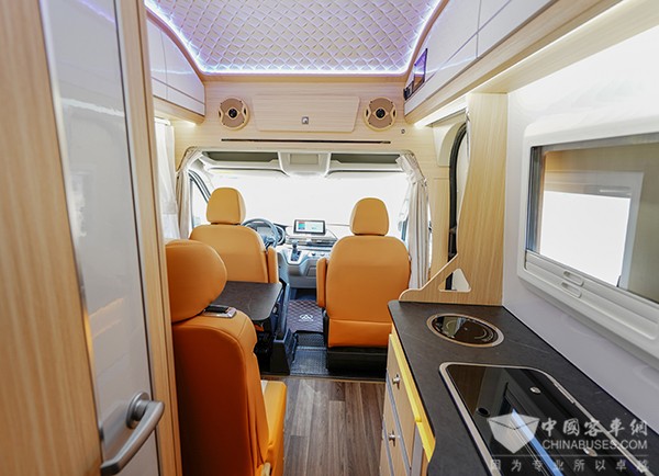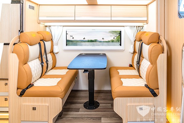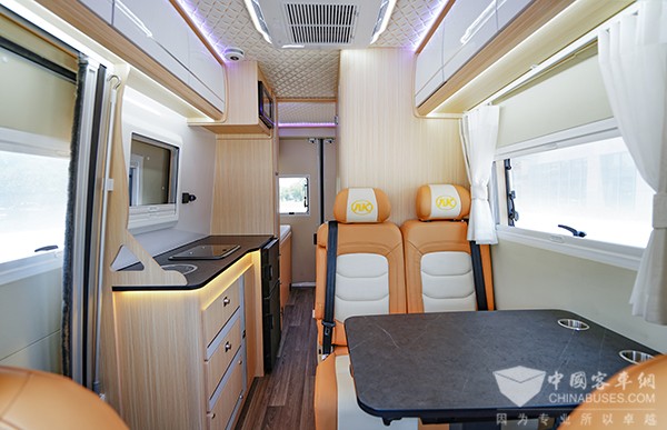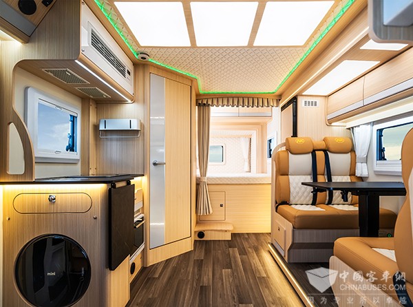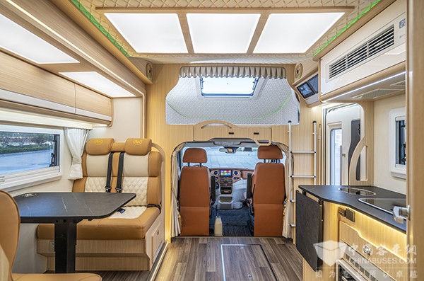该车生活区精选E0级环保生态板材家具+环保地板革,部件及工艺用胶均符合TVOC标准要求,同时,配置食用级净水箱及全车水管路,并应用车内健康环境管理系统,融合新风、净化及温度调节功能,让你在“移动的家”中静享惬意健康内环境。