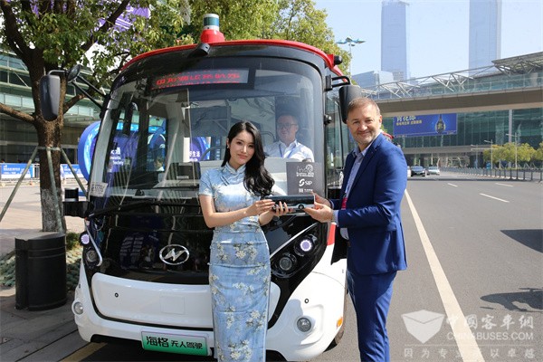 德国企业参展代表Reinhard Prutej先生当天乘坐苏州金龙海格L4级无人驾驶清原小巴从博览中心-酒店之间往返,感受智能交通的魅力。