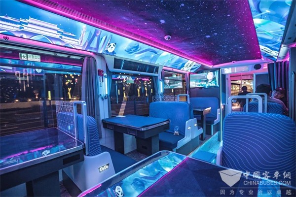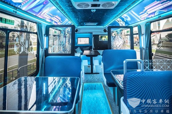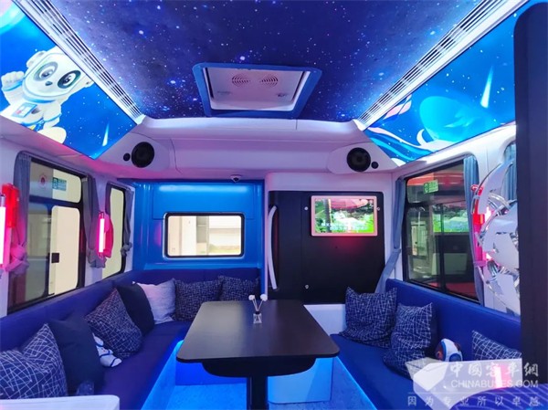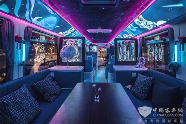 这辆“科幻巴士”的车身以蓝色为主色调,传递未来感的同时,将宇宙的自然景象转化成设计语言。