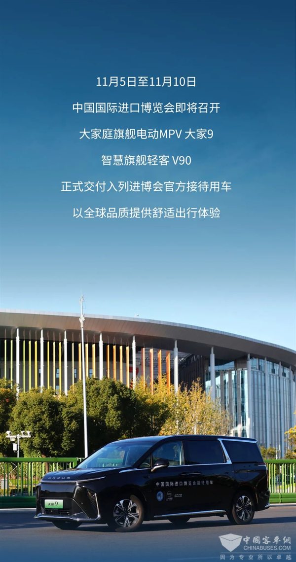 2023年11月5日至11月10日,中国国际进口博览会即将召开,大家庭旗舰电动MPV大家9,智慧旗舰轻客V90,正式交付入列进博会官方接待用车,以全球品质提供舒适出行体验。