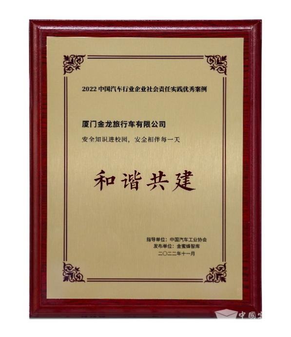 2022年11月8-10日,在中国汽车工业协会主办的“2022 中国汽车论坛”上,“绿色·责任·价值 推动汽车产业可持续发展”主题论坛发布了“2022 中国汽车行业企业社会责任实践优秀案例”,金旅客车“安全知识进校园,安全相伴每一天”案例荣获“和谐共建”奖。