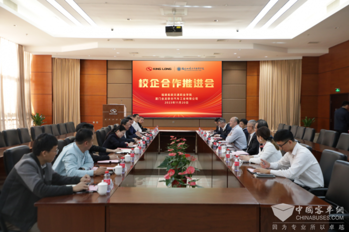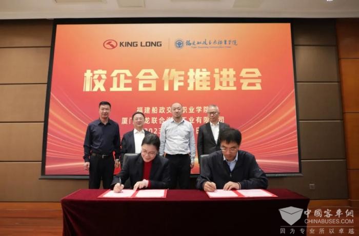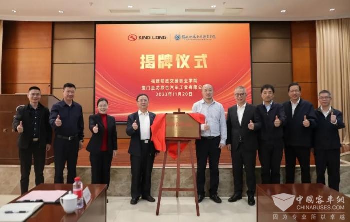 2023年11月20日,厦门金龙联合汽车工业有限公司(以下简称“金龙”)与福建船政交通职业学院(以下简称“船政交通学院”)在厦门金龙公司厂区举行战略合作协议签约暨揭牌仪式,并召开校企战略合作推进会。福汽集团党组成员、副总经理陈锋主持会议,船政交通学院党委副书记、校长陈锦辉,金龙党委书记、董事长刘志军,厦门市海沧区职业中专学校党委书记夏东风及相关负责人共同出席活动。