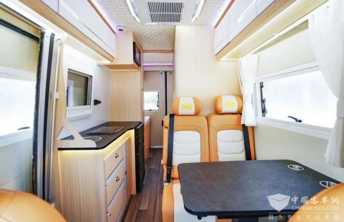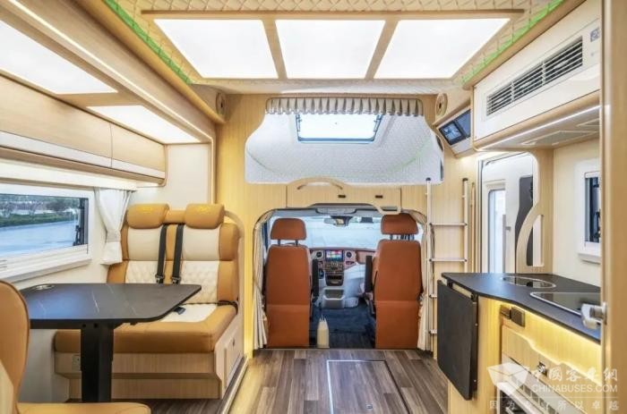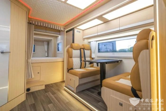 生活区内饰以浅色系为主,观感温暖,更贴近家的感觉。菱形格皮革包覆整车顶部与正副驾驶座椅,触感细腻,尽显高端质感。休息娱乐区采用双人卡座+可升降餐桌的设计,侧方设有大尺寸推拉窗,行车过程中也能打开通风,感受沁人心脾的清新花草香。