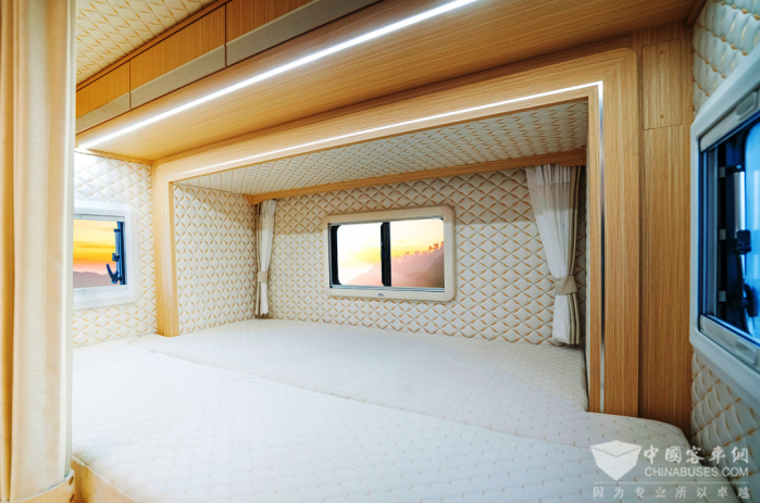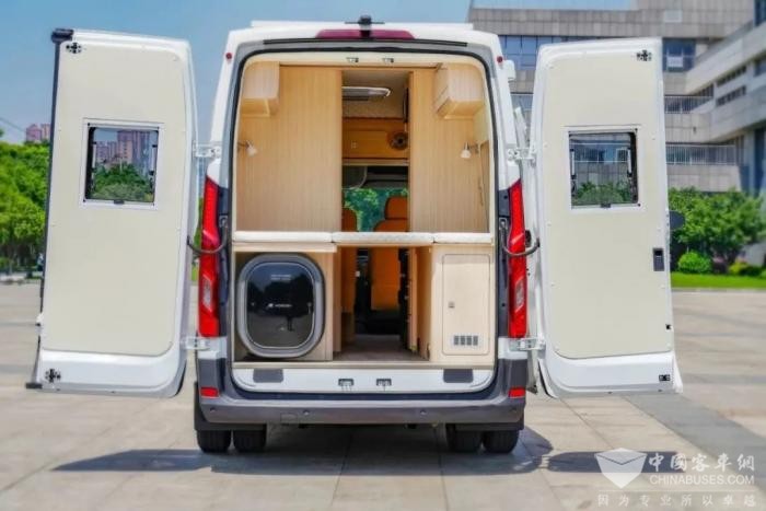 三段翻折式横置尾床设计,足够满足两个成年人休息,白天可当做贯通式过道使用,方便行李从车辆尾部进出生活区。同时,床铺顶部和下方均设有储物空间,方便放置零碎物品,还搭载一台房车专用洗衣机,有长期自驾行计划,也不担心衣物清洗问题。
