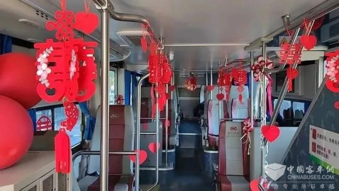 行驶在路上的安凯“公交婚车”,犹如流动的幸福驿站,见证着新人爱情升华的崭新篇章。车外,大红的“囍”字、“我们结婚啦”等喜庆的字样点缀车身,将幸福浪漫氛围推向高潮。车里,超大的车厢空间可轻松容纳一众亲朋好友欢聚一堂,共同见证这一重要时刻,让接亲过程更有仪式感。