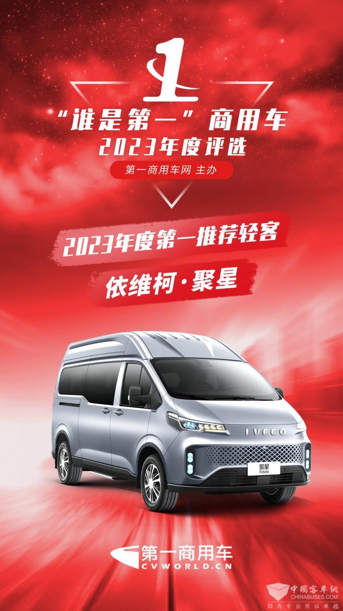 2023年11月29日,在2023(第八届)“谁是第一”商用车年度评选总决赛暨颁奖典礼上,依维柯聚星凭借智能驾控、出众颜值、超强运载、澎湃动力、安全可靠等性能表现,斩获“2023年度第一推荐轻客”荣誉称号。