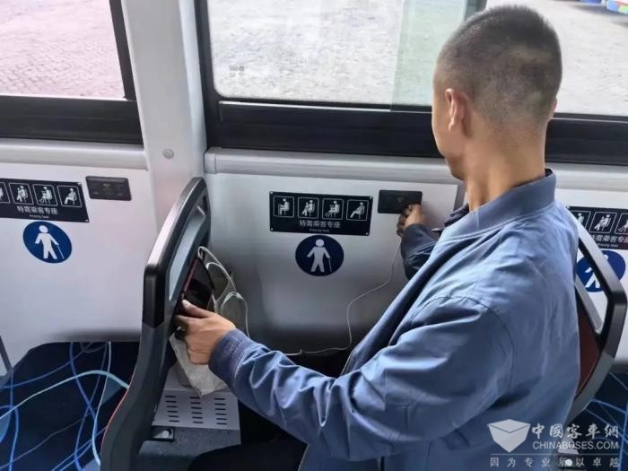 智能化和人性化配置是该车最亮眼之处。车厢内部的线路牌为电子站牌,可根据所经站点而动态显示。车上还配备了USB充电口和手机支架,座椅上也加装了坐垫。