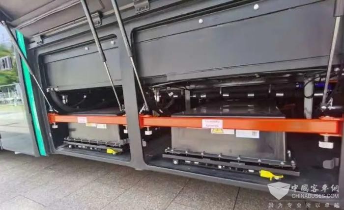 该车作为纯电动车型,采用宁德时代的磷酸铁锂电池,配备防碰撞、快速脱离等装置。北汽福田欧辉新能源客车事业部技术研究院高级经理周恩飞介绍,从外观看,防撞梁可以在侧面发生碰撞时保证电池不受挤压,不会发生热失控的风险。电池采用快速脱离结构,可以在15秒之内开舱门、解锁、从车上拖到地面。一旦发生极端情况,能够增加逃生时间。