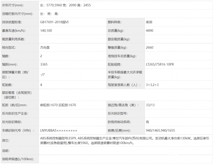 申报图上的这款依维柯越野汽车底盘采用的带车架的非承载式车身,有5770mm、5960mm两种长度,车身宽度为2090mm,高2455mm,驾驶室有3+3和2+3两种座椅布局可供选择。车辆驱动系统采用的是F1C柴油动力引擎,排量2998ml,功率132kW,符合国六b排放标准。