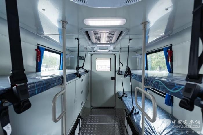 中舱每个床铺均配备2根安全带,防止人员、物品等坠落,每个床铺均配备独立插座,可以为手机、平板电脑等充电;顶部设置晾衣绳固定支架,为人员生活提供便利。