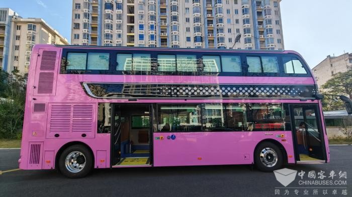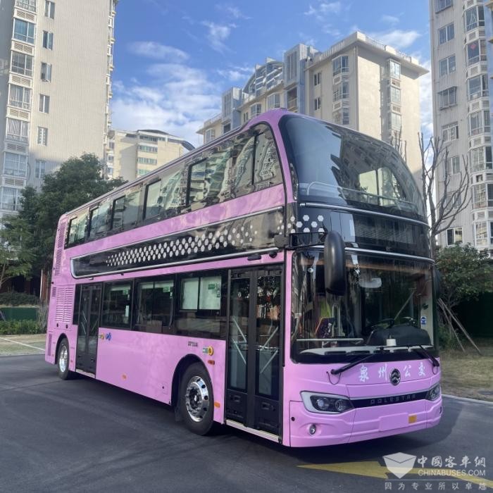 观光专线粉红体验开启!快跟随金旅这款双层巴士畅游泉州