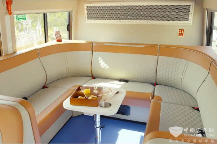 金旅北极星家族化前脸搭配精致璀璨LED大灯,彰显科技时尚;粉红色的车身和两侧大幅观景窗相得益彰,颜值满满。车辆采用一级踏步低地板结构,乘客可一步登乘,车厢内空间宽敞,乘客一层站立不碰头、二层行走舒适方便。内部空间设计上,豪华科技风格与“海丝名城”的城市定位更相配。车内设计了大量软包处理,最大程度呵护乘客安全。进口木纹地板革、高靠背豪华软座、吧台、无线充电器、多彩氛围灯、车载点歌系统、巨幅全景天窗,一切都是那么“高大上”。此外,到站提醒及景区风光介绍的高清大屏,带杯架独立办公桌,车内专设无障碍乘车设施和轮椅区以及爱心专座,极大提升乘坐舒适体验。