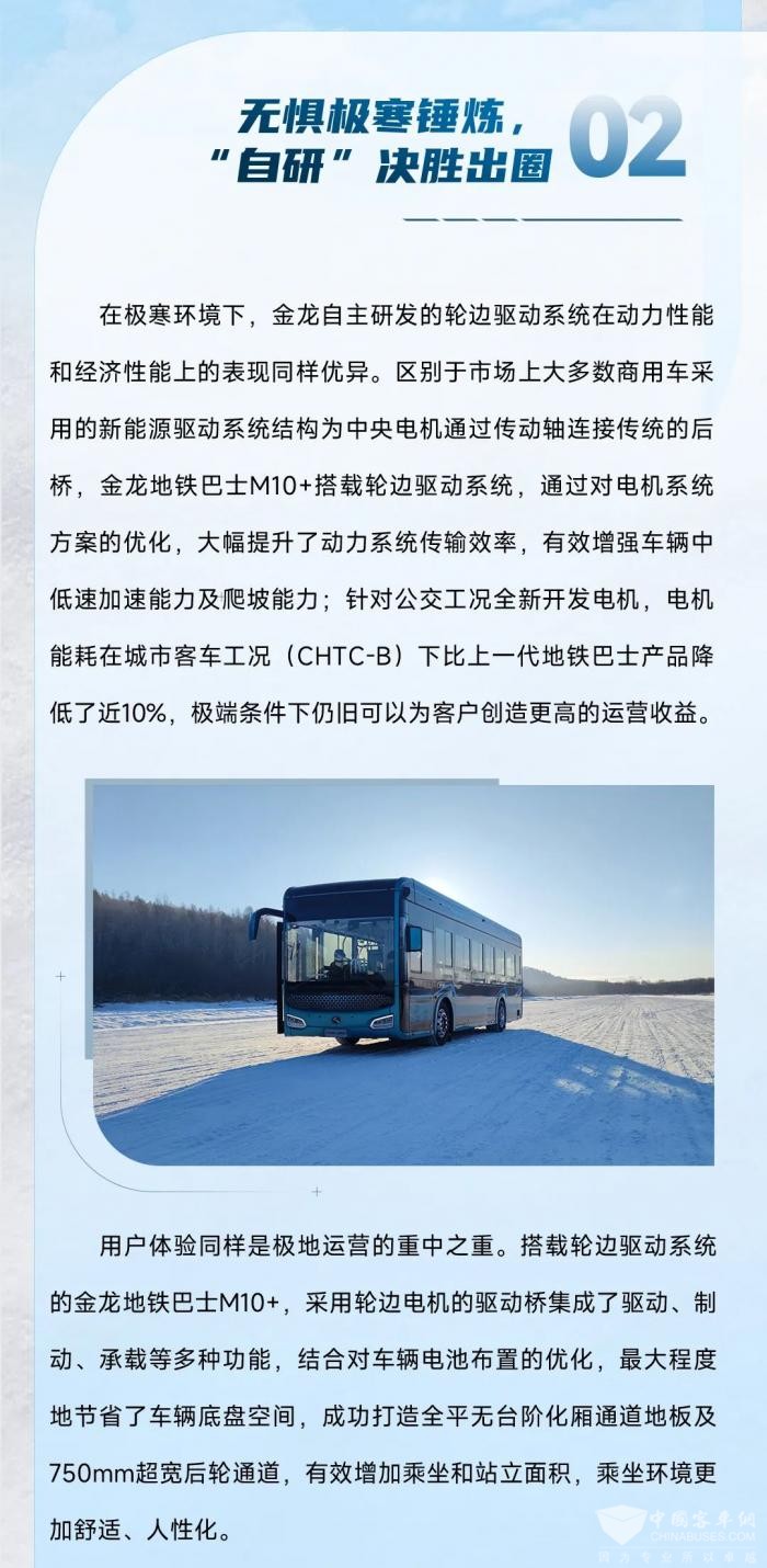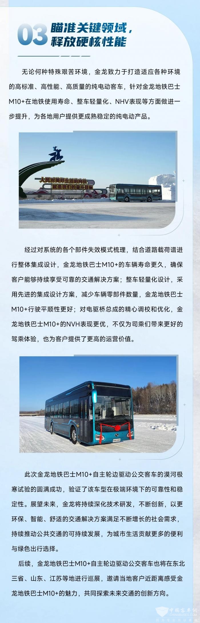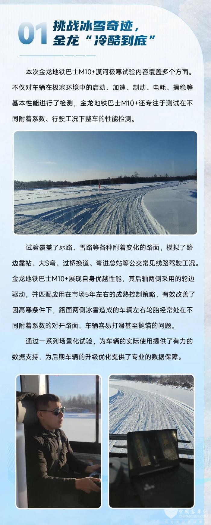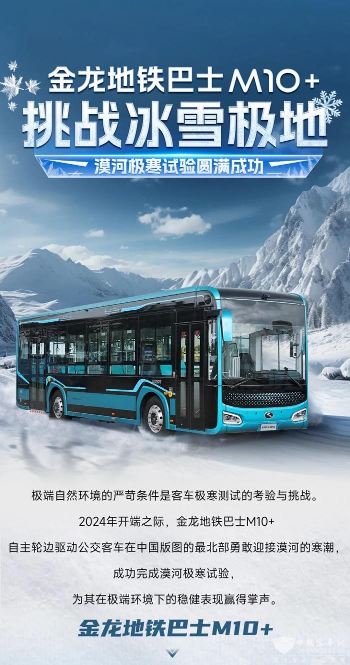 极端自然环境的严苛条件是客车极寒测试的考验与挑战。2024年开端之际,金龙地铁巴士M10+自主轮边驱动公交客车在中国版图的最北部勇敢迎接漠河的寒潮,成功完成漠河极寒试验,为其在极端环境下的稳健表现赢得掌声。