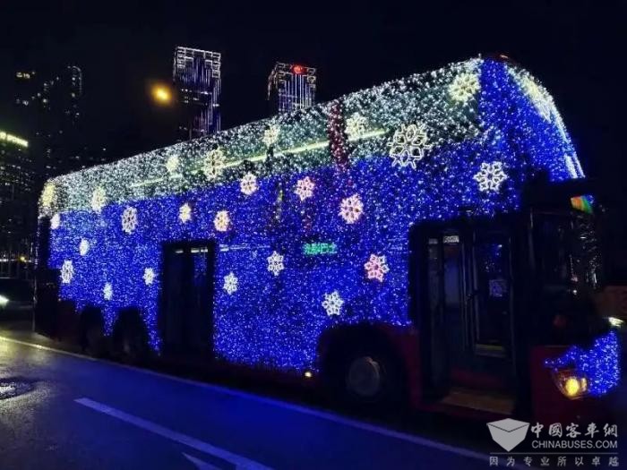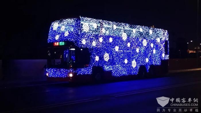 在几千条灯带与数万个LED灯泡的装点下,承担16路运输任务的安凯双层观光巴士也耀目焕新,穿上流光溢彩的华贵披风,随意装点的六角形雪花将冬日氛围感拉满,仿佛让乘客们进入了一辆“雪国客车”,感受从未体验过的雪夜风情。