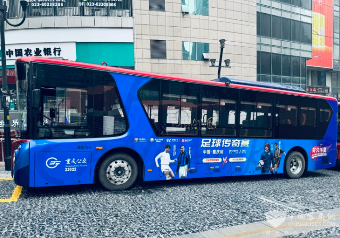 在重庆解放碑,乘客们可以很轻松地找到这些红蓝相间的主题观光巴士。苏州金龙风景巴士的外观造型极具辨识度,曾获得中国知识产权局第二十届中国专利奖。车身一侧喷涂的是足球传奇赛相关球星的头像,另一侧则喷涂了赛事相关的文化元素。