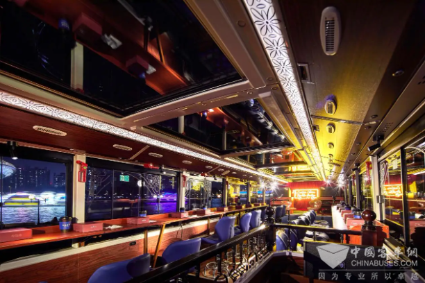 据悉,这些宇通纯电公交改装设计的音乐巴士,内部不仅有立体声环绕音响、无线手持麦克风、电视大屏、点歌台等设备,中部的观众区一改传统公交车的座椅摆设方式,旋转座椅围绕着不锈钢立柱打造的多个小吧台,还有配置储存柜和冰冻柜的备餐区,加上车身内外的音乐律动氛围灯,潮流酷炫的移动空间氛围感和互动感十足。
