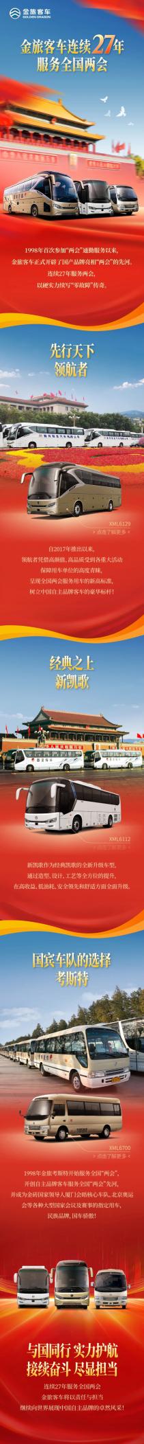 自1998年首次参加“两会”通勤服务以来,金旅客车正式开辟了国产品牌亮相“两会”的先河。连续27年服务两会,以硬实力续写“零故障”传奇。