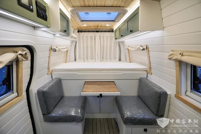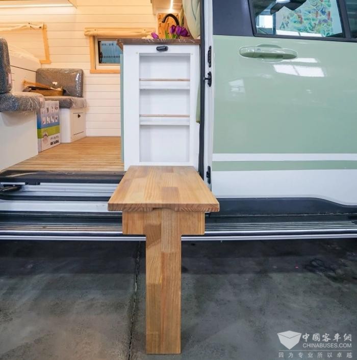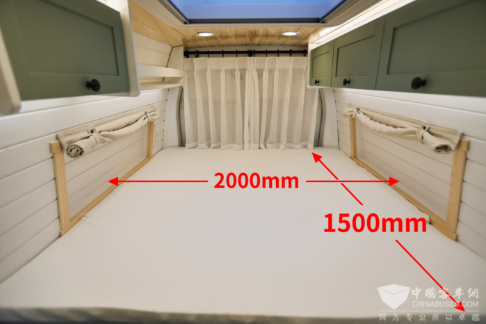 车尾部分设计了一个抽拉式床铺,展开后可以形成一个1.8*1.5m的宽敞休息区。在这里,您可以躺下享受宁静的午后时光,也可以邀请朋友一起分享旅途中的点滴趣事。床铺的舒适度和实用性都得到了精心设计,让您的房车生活更加美好。