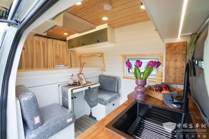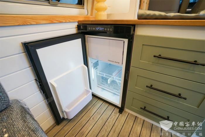 厨房区域一字型组合式橱柜、厨房吊柜、冰箱等设施一应俱全。特别是神仙收纳洞洞板置物架,让车内的储物空间得到了充分利用,让您的物品摆放有序。在这里,您可以轻松烹饪出各种美食,让生鲜蔬果、餐具用品都能得到妥善的收纳和洗涤。无论何时何地,您都能品尝到家的美味。