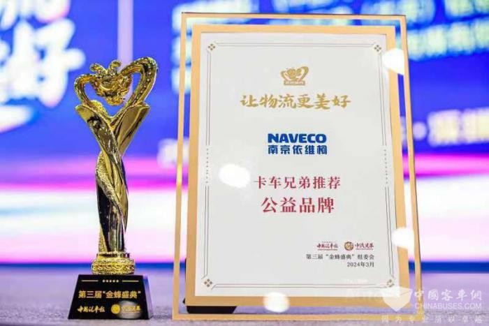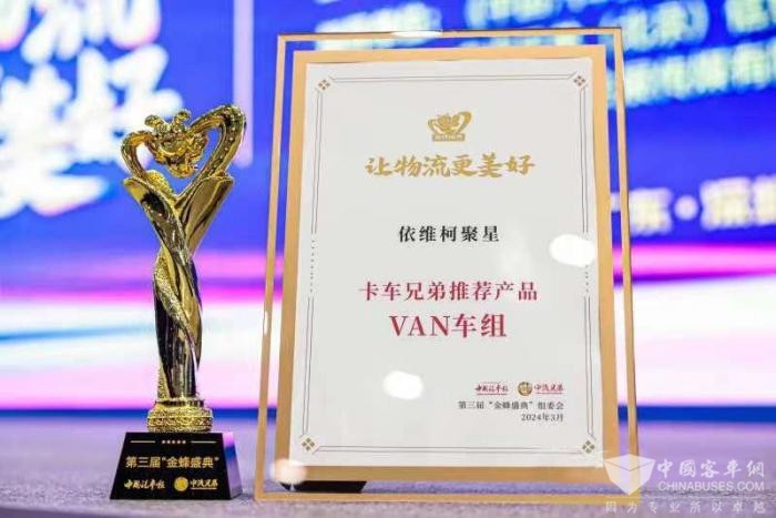 金蜂牵线,凝聚良善,弘扬先进,美好向前。2024年3月7日,由中汽兄弟携手中国汽车报社、中国汽研等单位共同举办的第三届“让物流更美好---金蜂盛典”在广州深圳隆重举行。在这场由车企、部件、车后市场、物流运输企业、优秀运输人共同参与的公益盛典上,南京依维柯凭借多年来在企业社会责任和公益事业方面的杰出贡献荣获“卡车兄弟推荐公益品牌”,旗下产品依维柯聚星以备受用户信赖的卓越产品性能摘得“卡车兄弟推荐产品——VAN车组”殊荣,硬核实力,实至名归。