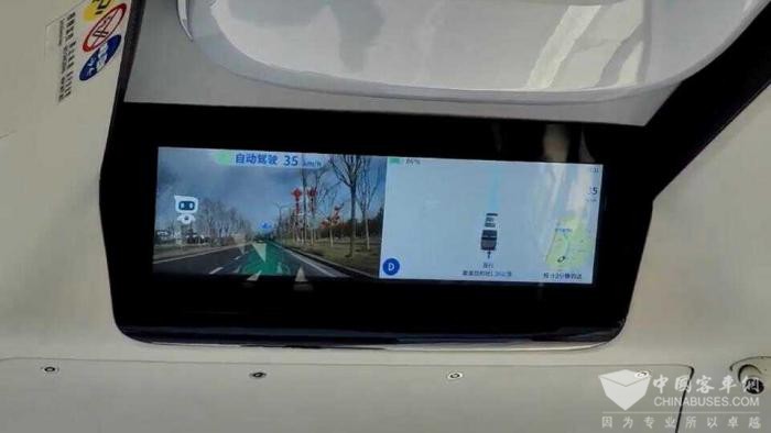 另外,在车辆上方有一块显示屏,左侧能够通过摄像头实时监测到前方车辆、非机动车及行人的动态,包含与前车车距、自动行驶速度等参数,右侧则为线路导航,可分辨具体线路,会标注与目的地的距离。