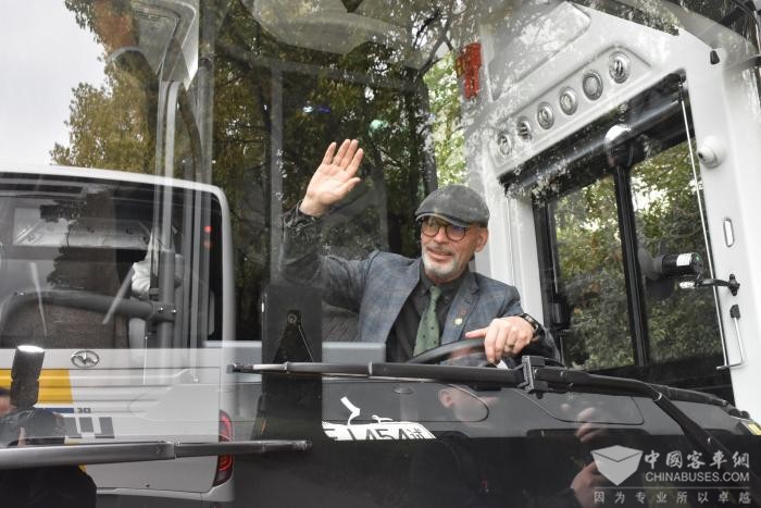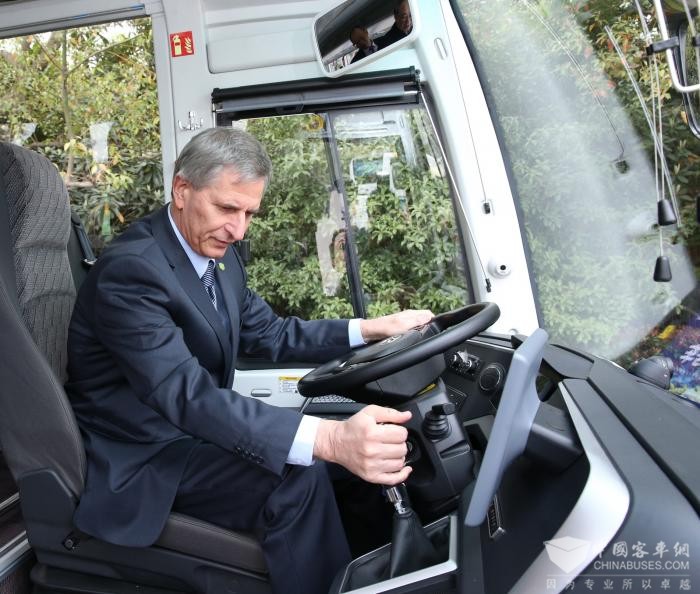 在参观展车环节,驻华使节还纷纷登上苏州金龙面对全球市场研发的新V系智慧客车,感受了现代化客车的舒适驾乘体验并频频点赞。格林纳达驻华大使马岩表示,很荣幸能来到海格,了解到更多关于产品、技术进步以及海格的未来规划。他还特意用汉语表示,在格林纳达目前只有苏州金龙的传统动力车型,这次参观苏州金龙感觉新能源车型非常好。